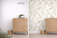 Un papel pintado con ilustraciones de hojas verdes en tonos suaves, diseñado para crear espacios luminosos, delicados y equilibrados. Ideal para aportar elegancia natural sin recargar el ambiente.